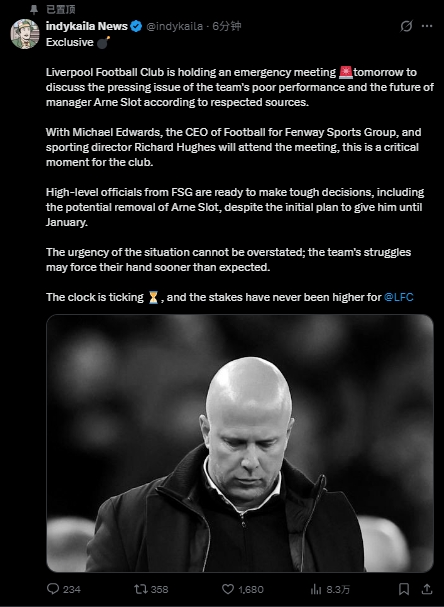 这样的紧急会议表明俱乐部高层对当前情况的重视,芬威集团显然已经做好了准备,可能会作出艰难的决定,包括提前解除斯洛特的主教练职务,尽管本来的计划是让他执教到明年1月。