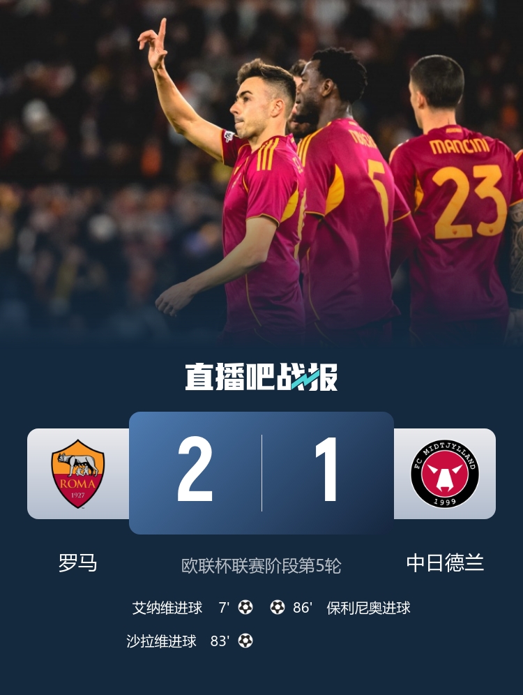 在11月28日的凌晨1:45,欧联杯小组赛的第五轮中,罗马在罗马奥林匹克球场迎战中日德兰。比赛一开始,罗马就展现了强烈的进攻欲望。第7分钟,切利克在右路传出一记精准的45度角传球,艾纳维在禁区内巧妙地凌空抽射,将球送入对方网底,为罗马取得了1-0的领先。