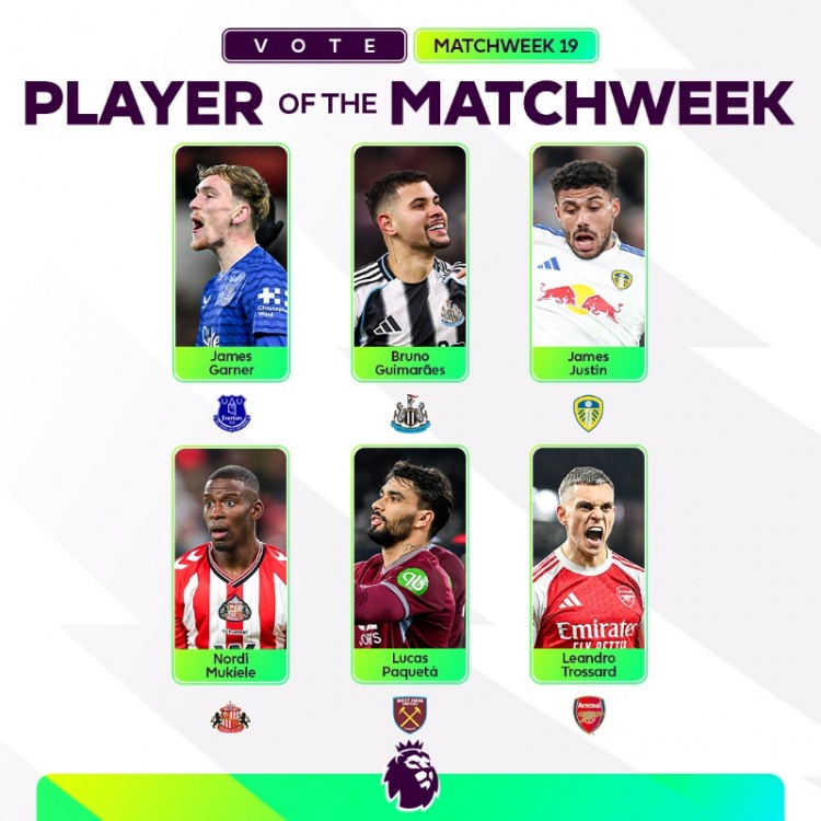 英超官方在1月2日公开了第19轮最佳球员的候选名单,六名优秀球员入围,他们分别是詹姆斯·加纳、布鲁诺·吉马良斯、詹姆斯·贾斯汀、穆基勒、帕奎塔和特罗萨德。