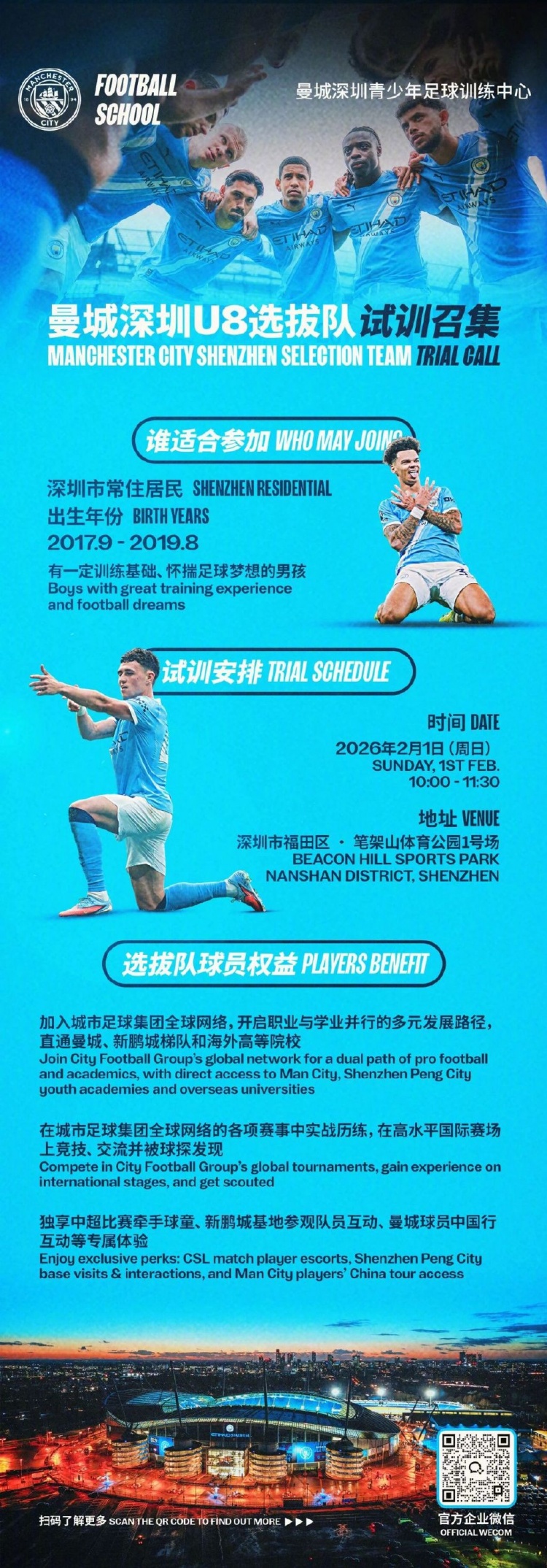 曼城足球俱乐部近日在其官方微博上发布了关于深圳U8选拔队的试训召集公告。这次试训面向出生于2017年9月至2019年8月之间的深圳常住男性居民,旨在寻找具备较好训练基础和足球梦想的年轻球员。试训定于2026年2月1日举行,地点设在深圳市笔架山体育公园。