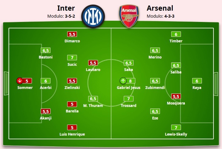 国际米兰方面,门将索默面对此次生死攸关的较量,仅获得了5分的低分。后防线上的阿坎吉和阿切尔比也未能抑制住对手的进攻,分别获得了5.5分和6分的评价。巴斯托尼稍显突出,以6.5分的成绩略显安慰。在中场,路易斯·恩里克和巴雷拉的发挥显得比较失常,分别仅有5分的成绩。泽林斯基在表现上稍有起色,得到了5.5分,而佩塔·苏契奇凭借着不俗的表现取得了7分,成为本队中为数不多的亮点之一。前场球员中,马库斯·图拉姆和劳塔罗同样未能交出令人信服的答卷,分别获得了6.5分和5.5分的评分。而大多数替补球员如弗拉泰西、齐沃、埃斯波西托等人也未能带来意想中的变化,全队整体表现颇为平庸。