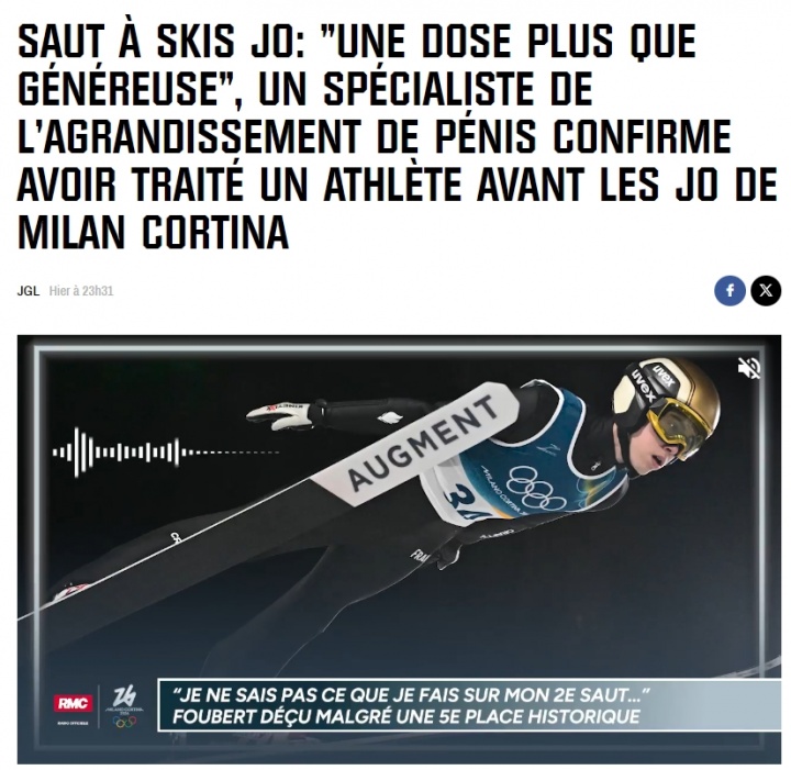 根据法媒RMC的报道,来自美国的媒体《今日美国》报道称,一位专业进行男性生殖器增大手术的医生亚历山德罗·利塔拉在采访中表示,他曾在米兰冬奥会开赛前几周为一名跳台滑雪运动员进行了相关的治疗。
