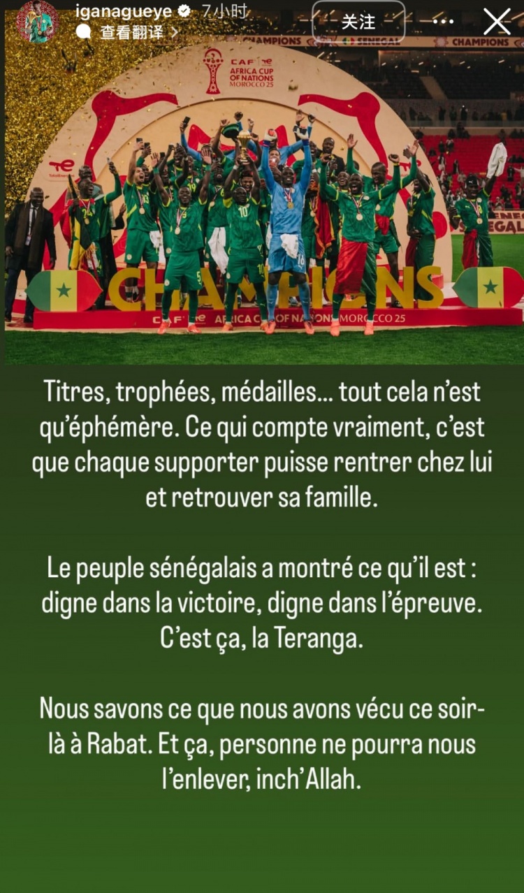盖耶继续传递着塞内加尔人民的精神风貌:“我们在胜利时保持尊严,在面对挑战时也同样如此。这就是我们特兰加精神的真实写照(特兰加在当地语言中表示热情好客)。”他重温了那段铭刻在心的记忆:“那一晚,我们在拉巴特,不会有人能抹去我们心中的印记。愿真主保佑我们。”