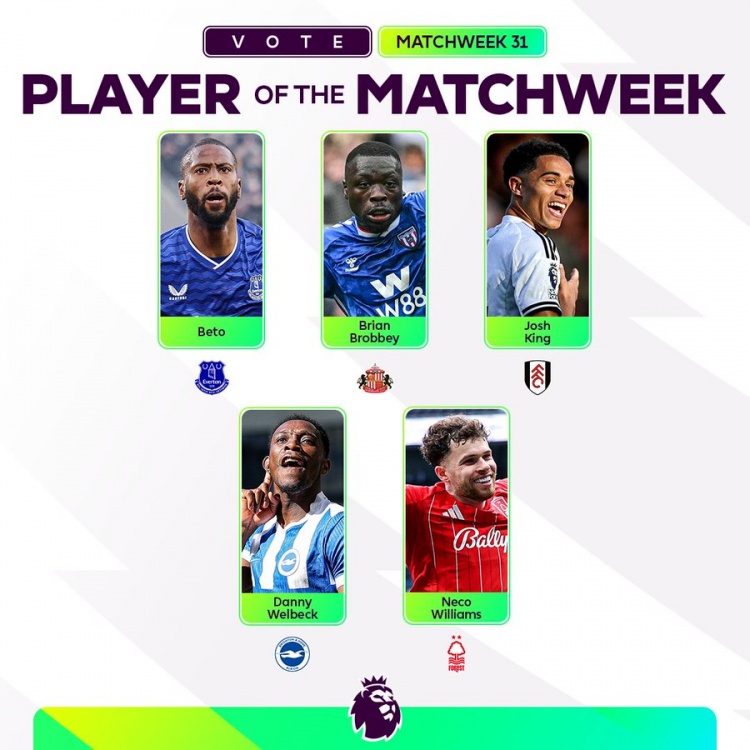 在英超第31轮的比赛结束后,联赛官方公布了本轮最佳球员候选名单。五位表现出色的球员被提名,分别是贝托、布罗比、乔希·金、维尔贝克和内科·威廉姆斯。