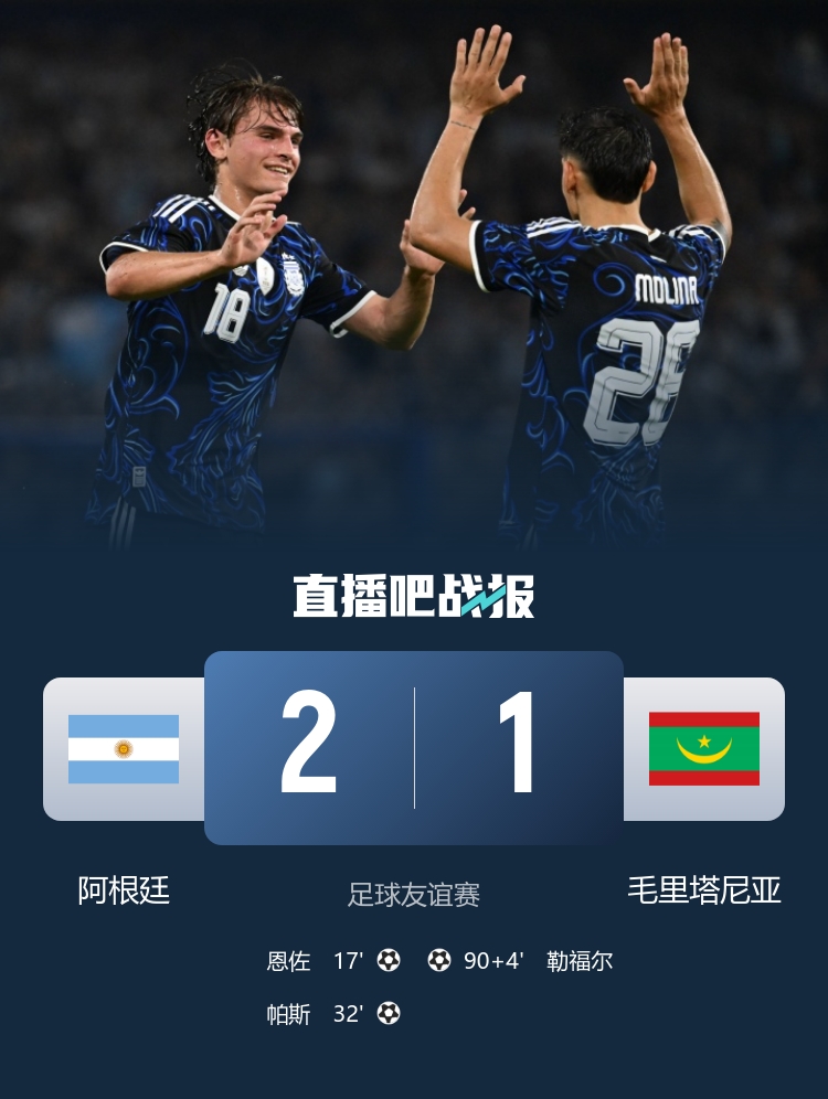 在阿尔贝托J阿曼多体育场举行的国际足球友谊赛中,阿根廷队迎战排名第115的毛里塔尼亚。尽管阿根廷队的FIFA排名位居第二,本场比赛梅西作为替补待命。上半场,阿根廷队的莫利纳展现出出色的助攻能力,助力恩佐在第16分钟时推射破门,为阿根廷首开记录。随后,帕斯在第31分钟利用定位球机会直接打门,成功扩大比分至2-0,半场结束时阿根廷领先毛里塔尼亚。