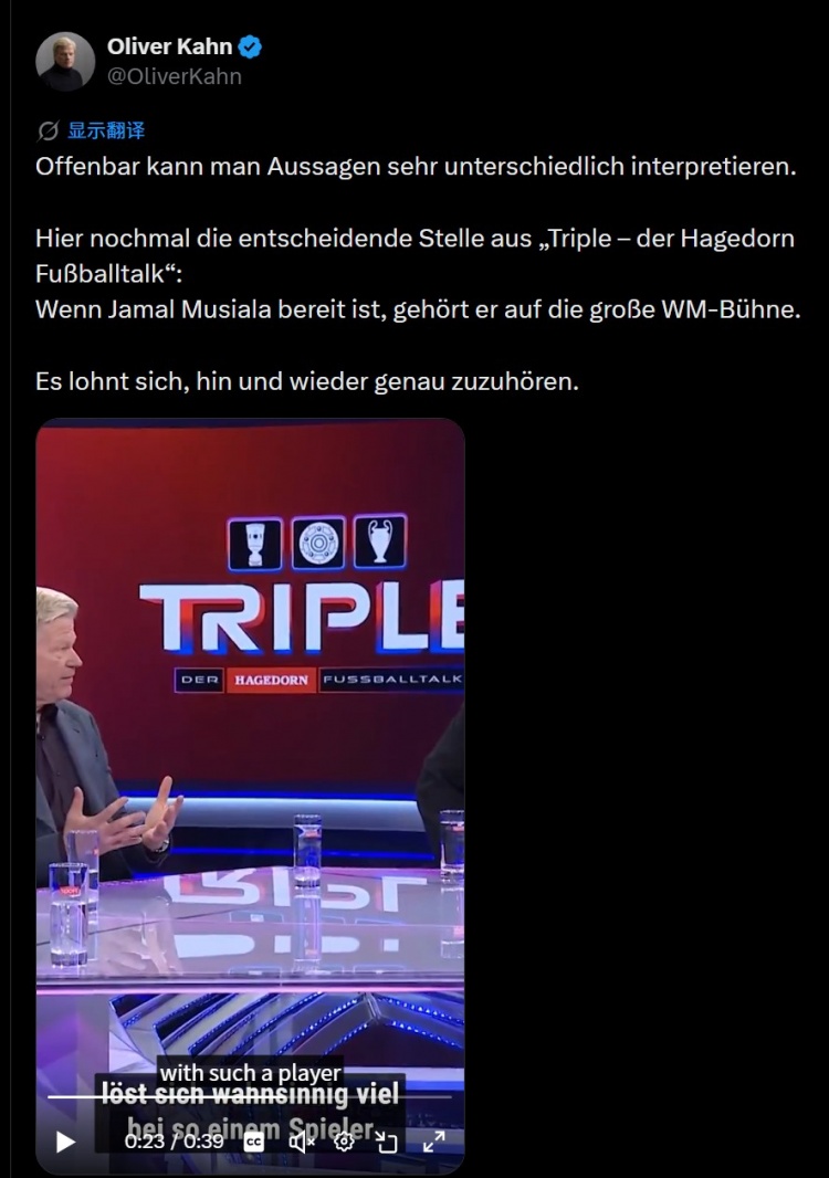 为了解释自己的立场,卡恩在社交平台上分享了节目中的一段视频,并表示:“显然,同一句话会有不同的解读。节目中我提到过,‘如果穆西亚拉准备好了,他就应该走上世界杯的舞台。’所以有时候,仔细听听别人怎么说是很重要的。”