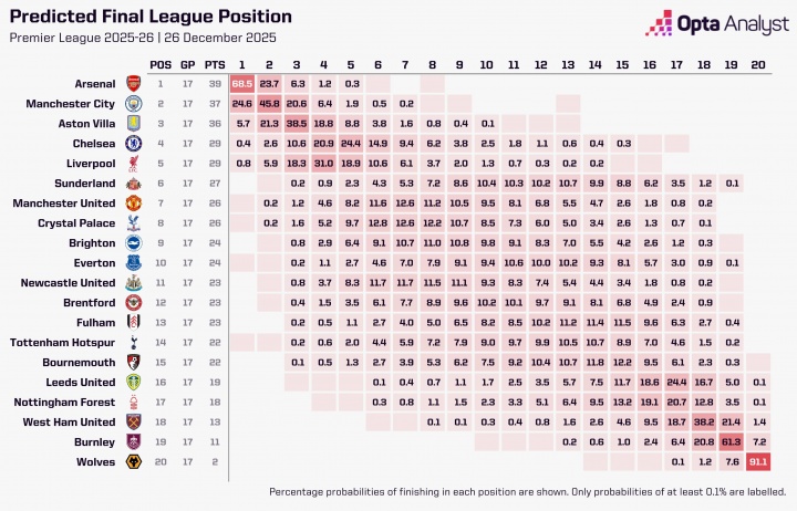 在最新的英超夺冠预测中,阿森纳的概率稍微降低了,依然以68.5%的胜算高居榜首。不过,值得注意的是,曼城紧随其后,尽管只有24.6%的概率,也在紧张地追赶;而阿斯顿维拉则以5.7%的微弱希望摇摇欲坠,紧跟在第三的位置上。至于利物浦,似乎已经感觉到了被甩在了上游的耻辱,只有0.8%的概率,简直是拼了命也没能吹响一下逆袭的号角。切尔西更是惨不忍睹,只有可怜的0.4%,甚至可以用“毫无希望”来形容他们的奢望。