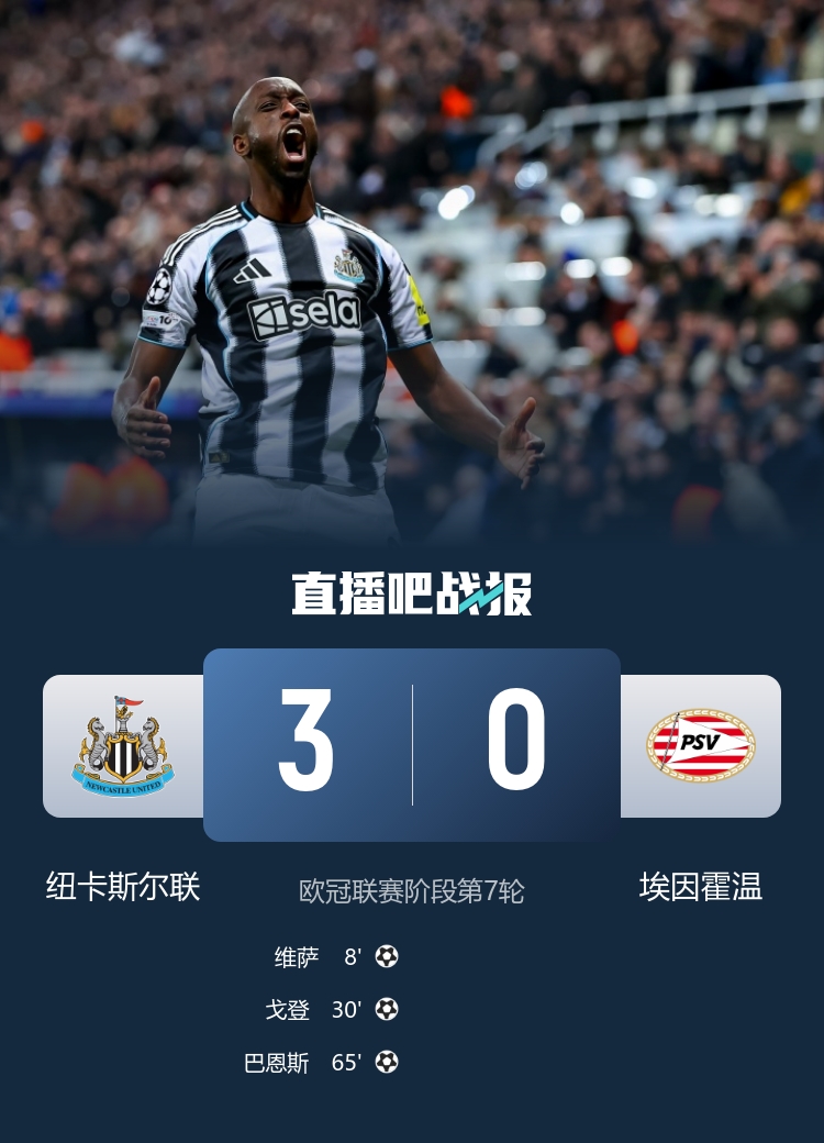 在北京时间1月22日清晨4:00,欧冠联赛阶段的第7轮较量在圣詹姆斯公园球场进行,纽卡斯尔联迎战埃因霍温。赛事上半场,纽卡斯尔联的维萨表现出色,不仅自己破门得分,还为队友创造机会,帮助球队在主场以3-0的比分取得胜利,从而暂时升至欧冠积分榜第7的位置。
