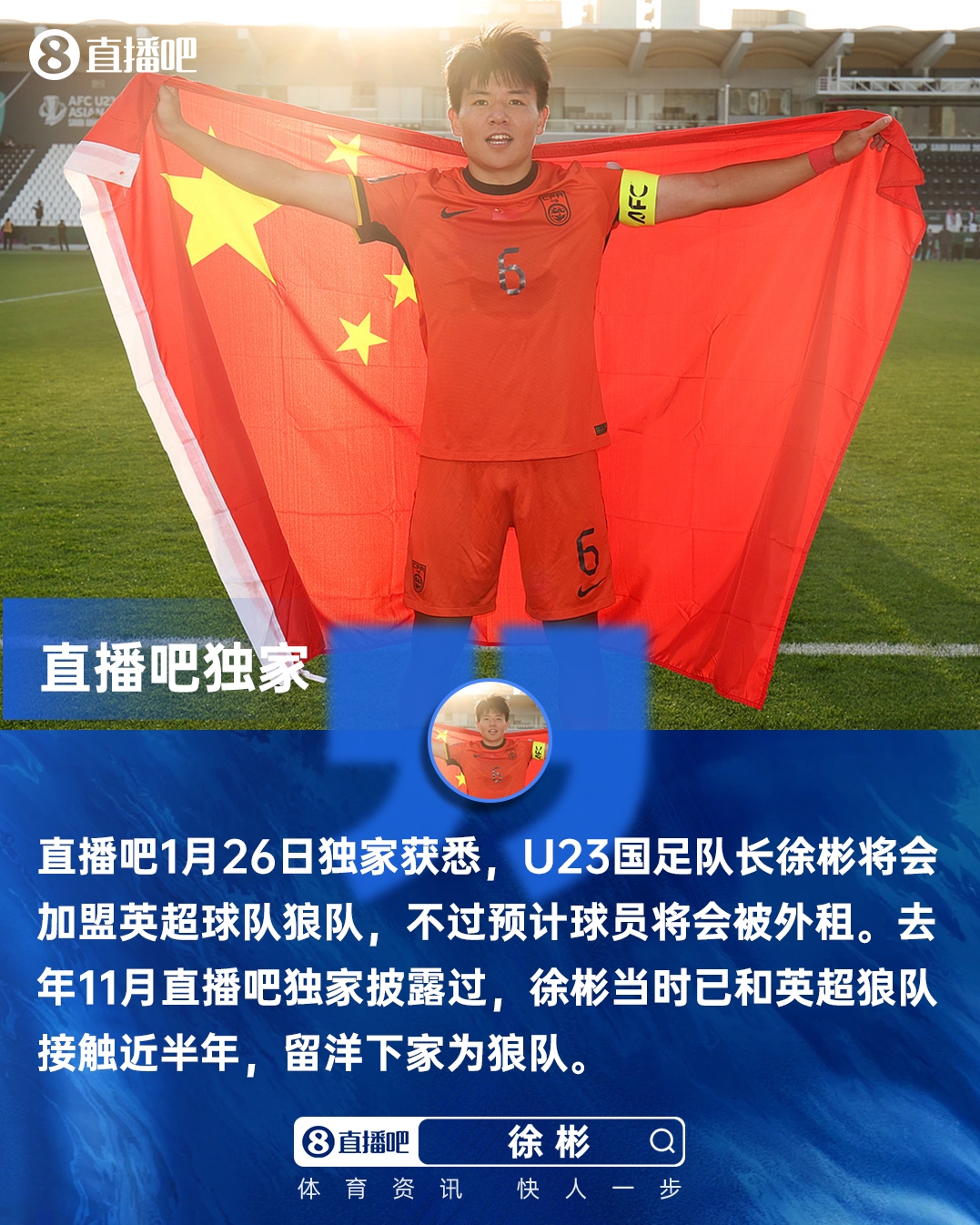 近日,来自独家的消息透露,U23国足队长徐彬将会加盟英超豪门狼队,但他很可能将被外租。早在去年11月,就有消息传出,徐彬与狼队的接触已持续了近半年,看来这笔转会终于要落地了。