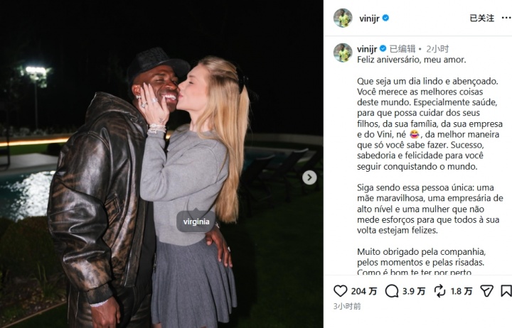 在4月6日这一天,对于维尼修斯来说意义非凡,因为他的女友维吉尼亚庆祝她的27岁生日。为了表达他的爱意,维尼修斯在社交媒体上发出了温馨的生日祝福,字里行间满是浓浓的情意。