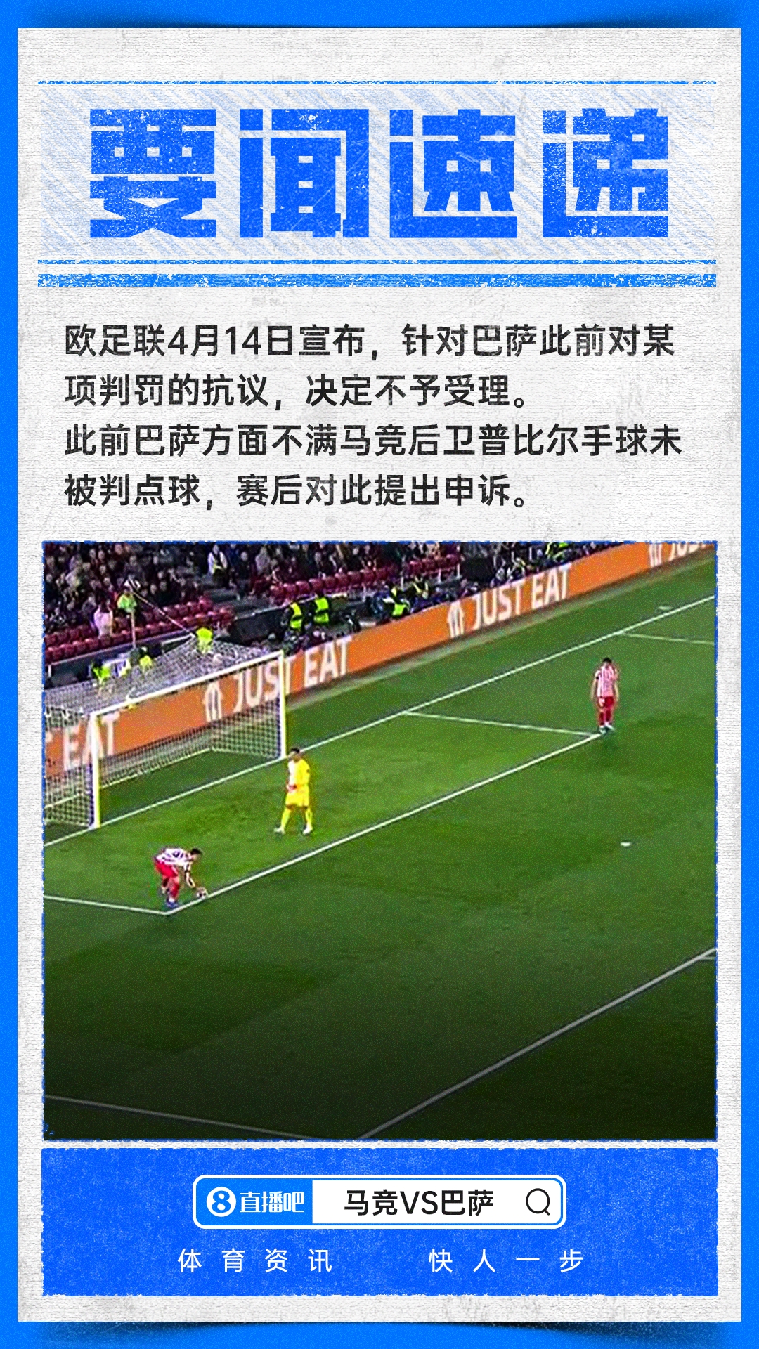 欧足联于今天发布了一项声明,确认对巴塞罗那足球俱乐部在欧冠四分之一决赛首回合比赛中提出的抗议不予受理。